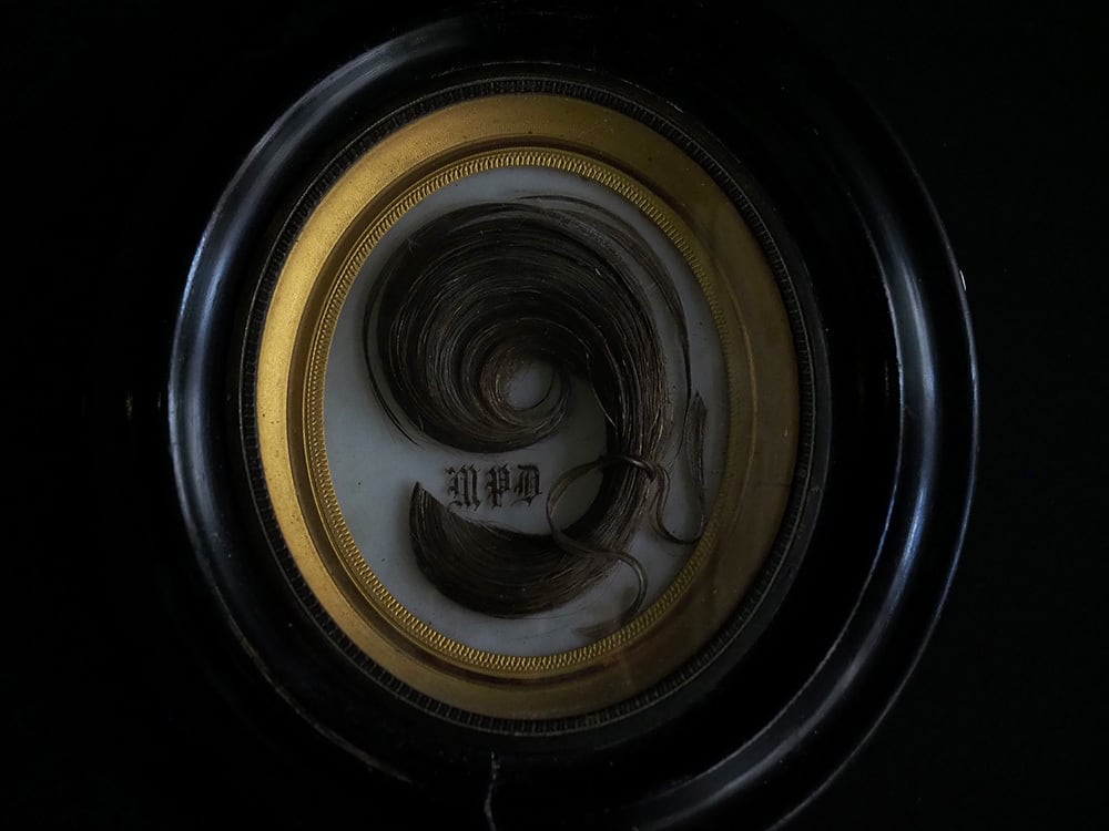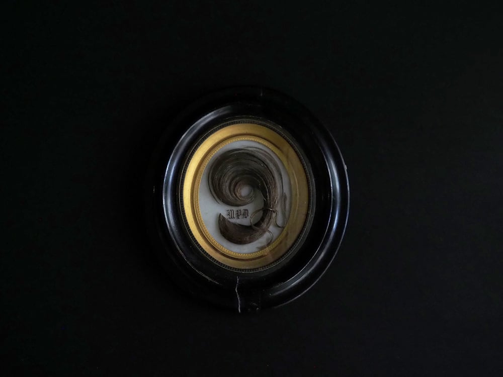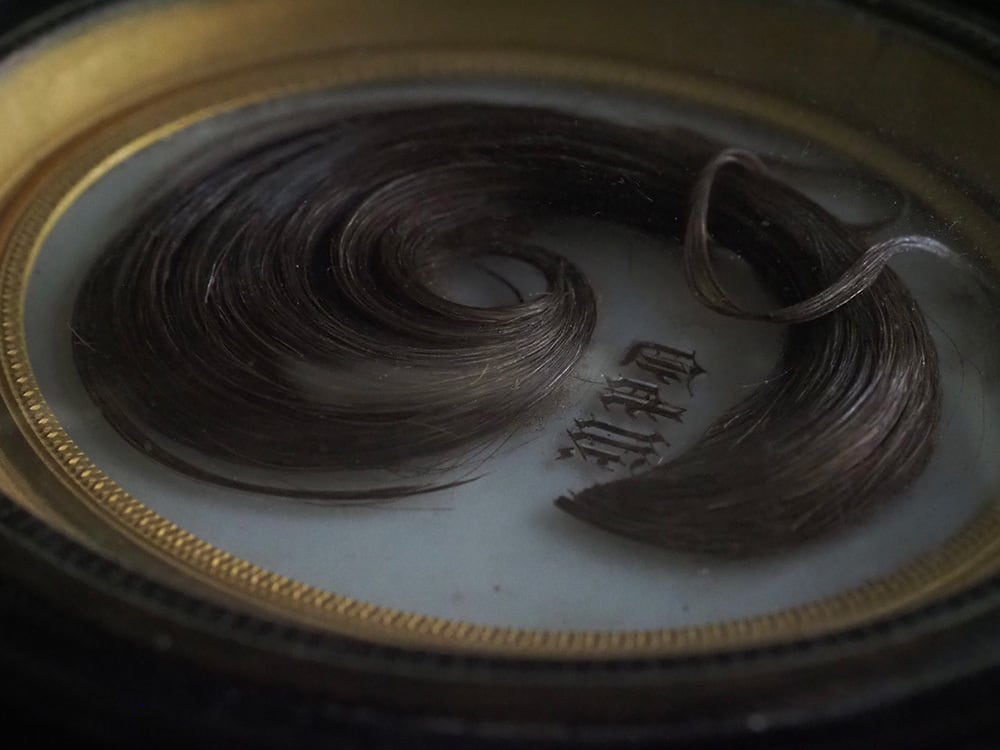 結んでいる紐も遺髪、そしてイニシャルも遺髪で細工されています