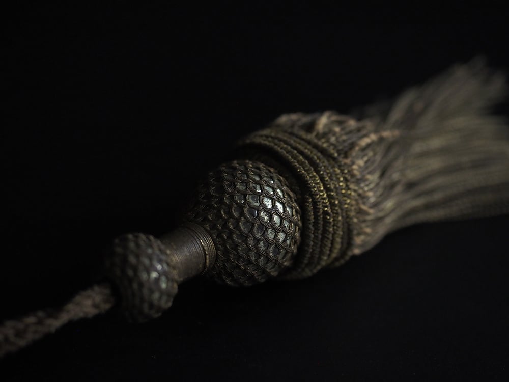 ▫︎ 金糸のタッセル 2点 ▫︎ 品番 250721 ▫︎ 年代・国 19-20世紀初頭 France ▫︎ サイズ 約145×32mm(紐部分も含めると280mm)/ 約158×20mm紐部分も含めると210mm) ▫︎ 配送サイズ 60-80サイズ 古いタッセル 2房 金糸が使われていてハリと重量があります 大きい方のタッセルの上部 丸い部分は銀色の球状のパーツを包み込むように造られています 蓋部分に折れ癖・汚れ・解れなどあります ※装飾品は含みません
