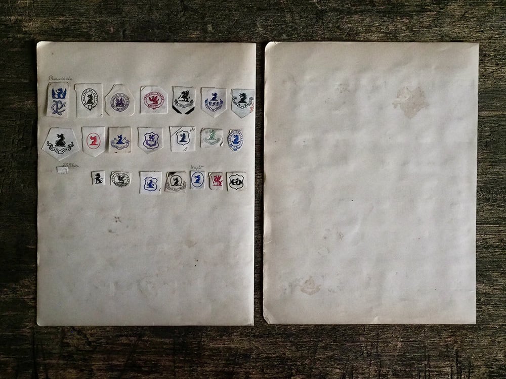 切り取られたモノグラムとエンブレムが貼られたシート2枚