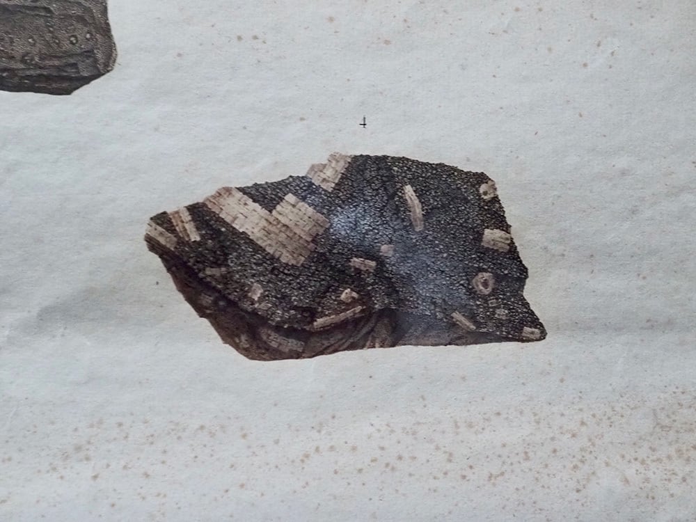 シミがあるものの鉱物の再現度・色付けともに最高ランクの鉱物図版です