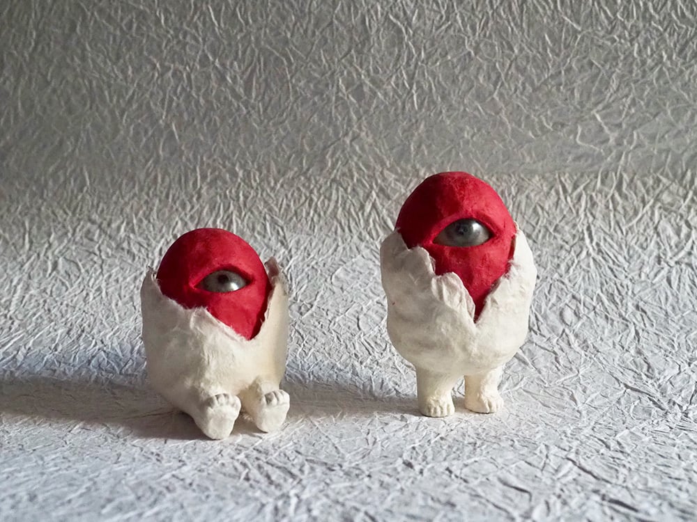 タマゴタケの幼菌の妖精をイメージした和紙でできた作品でキガンピニオンの子供の設定
