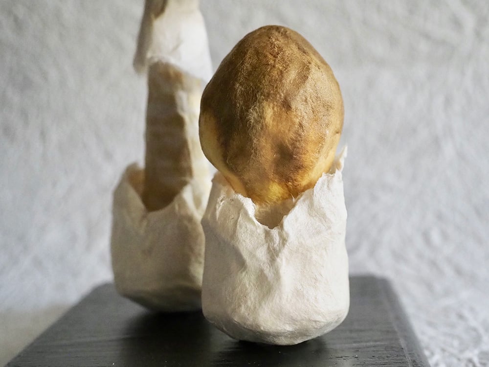 傘の裏のヒダ、幼菌のツルッとした姿も繊細に表現されています