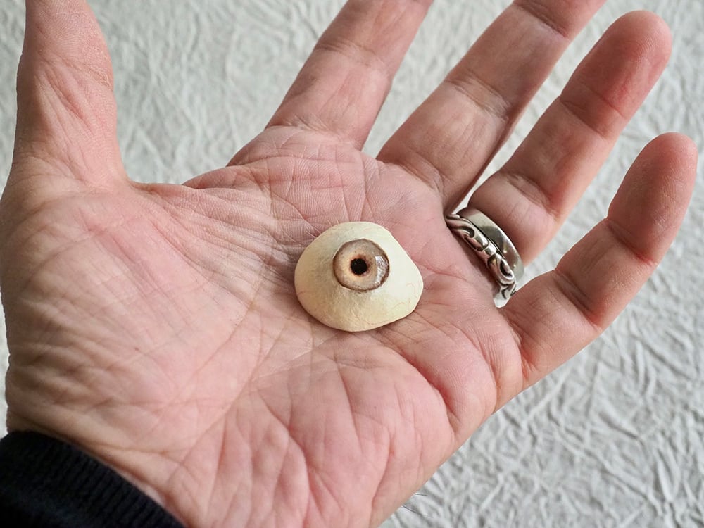 実際の義眼を観察して白目にニュアンスもそれぞれ違うことから、全て違う和紙を使って表現しました