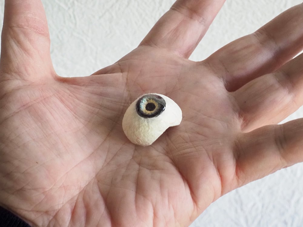 実際の義眼を観察して白目にニュアンスもそれぞれ違うことから、全て違う和紙を使って表現しました
