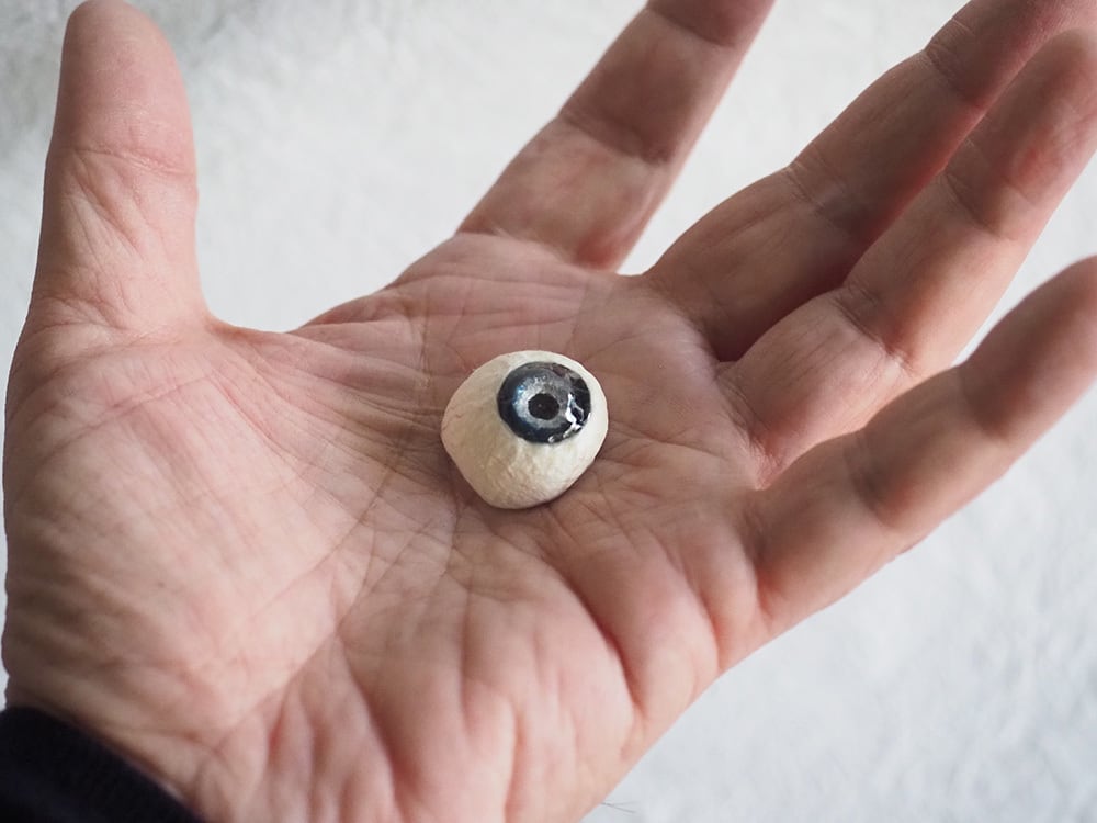 実際の義眼を観察して白目にニュアンスもそれぞれ違うことから、全て違う和紙を使って表現しました
