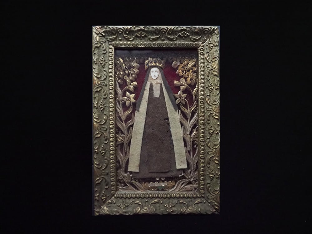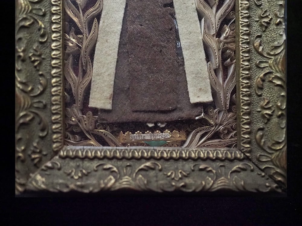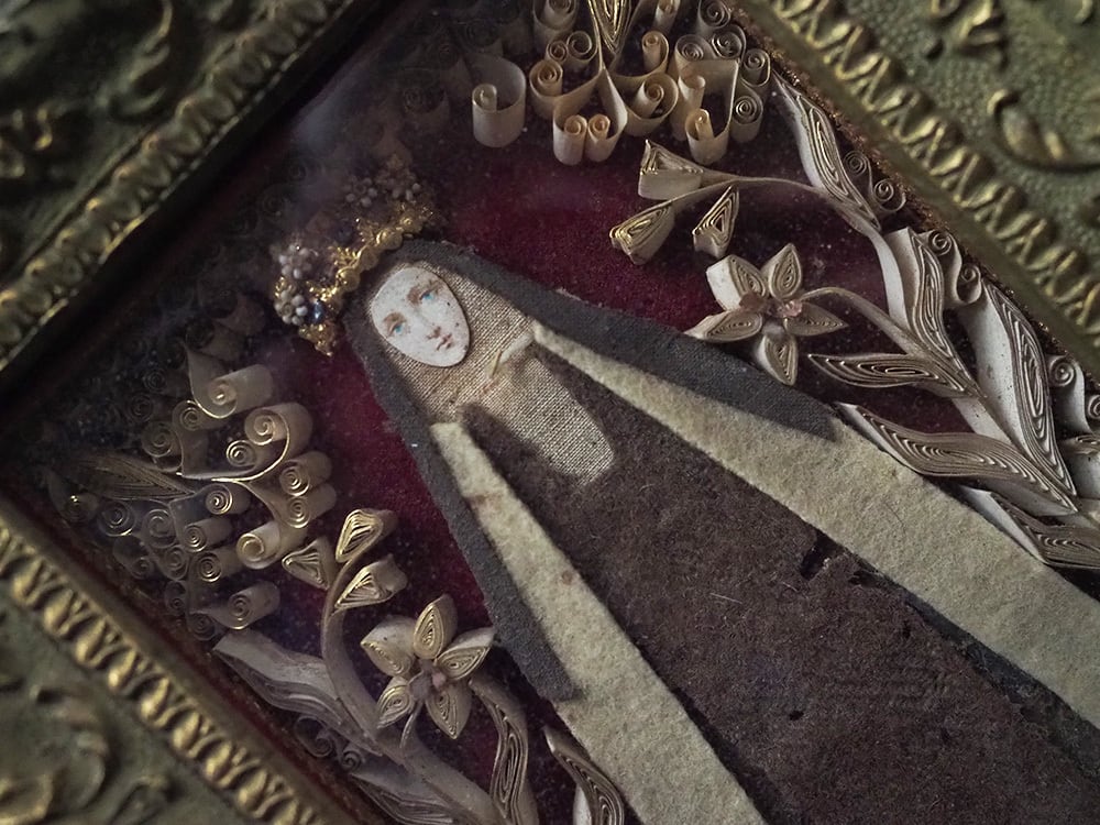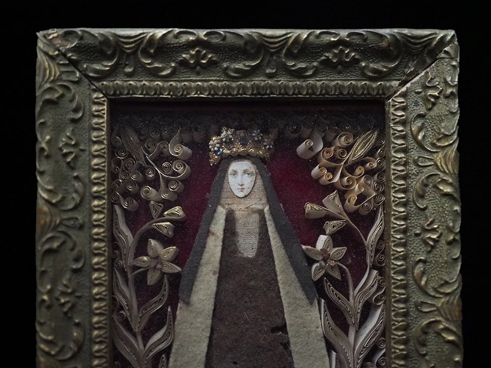 中央に冠の細工が素晴らしく全身は逆に簡素の布で表現された聖テレサが、その周りを繊細なペーパー・クイリングの装飾が施されています