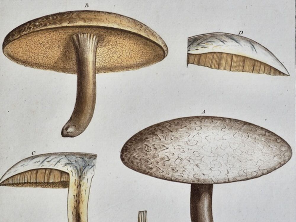 繊細な線はエングレーヴィングで、アクアチントで陰影や色彩が付けられていて、とても完成度が高いく、キノコ図版の最高峰だと思います